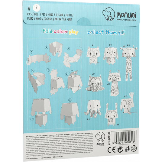 - Przestrzenny, mały model zwierzaka z dużą głową do kolorowania - Wykonany z białego kartonu - Precyzyjnie wycięte elementy, łatwe do złożenia bez kleju czy nożyczek - Obrazkowa instrukcja na tyle opakowania - Złożony model jest stabilny, wytrzymały i lekki - Profesjonalna grafika, druk w kolorze czarnym - Odpowiedni do kolorowania kredkami, flamastrami, markerami i farbami - Karton dobrze absorbuje wilgoć, nie fałduje się i nie przecieka - Wymiary produktu: 15,5 x 14 x 14 cm - Model: pies