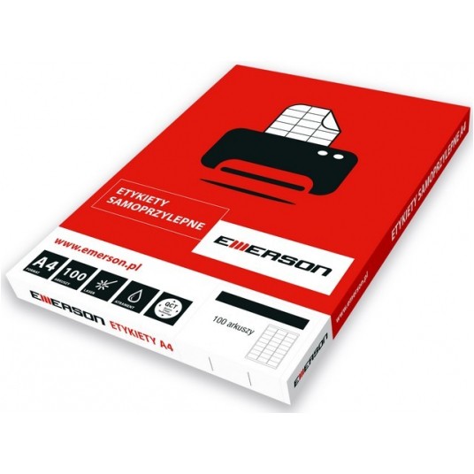 - białe, samoprzylepne dostarczane są na arkuszach o formacie A4 - współpracują ze wszystkimi rodzajami drukarek igłowych, atramentowych i z większością drukarek laserowych (patrz zalecenia producenta drukarki) - dostępne w wersji z tzw. Quatro Clean Technology - tj. z krawędziami bezpieczeństwa, które zapobiegają odkładaniu się kleju na mechanizmie drukarki - niektóre formaty etykiet dostępne również w opakowaniach po 1000 arkuszy - w kartonie znajduje się 10 opakowań - na stronie www.emerson.pl dostępne są szablony do zadruku etykiet