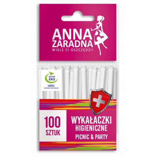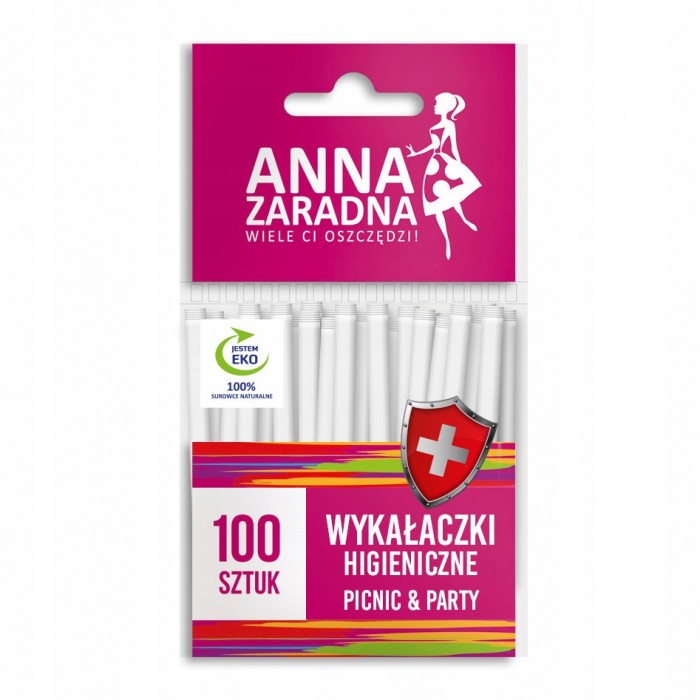 - Drewniane wykałaczki, jednostronnie ostrzone, doskonale nadają się na imprezy okolicznościowe w domu i na świeżym powietrzu, sprawdzają się także podczas grilli i pikników. - Niezastąpione w każdym barze szybkiej obsługi. - Każda wykałaczka jest zapakowana osobno, w białe opakowanie papierowe, co sprawia, że są dużo bardziej higieniczne w użytkowaniu. - Tolerancja parametrów produktu: +/- 5% - Długość jednej wykałaczki: 8,5 cm - Średnica: 1,1 mm - Ilość: 100 szt - Surowiec: biały papierek, drewno brzozowe - SUPER HIGIENICZNE! - Każda wykałaczka zapakowana oddzielnie - EKO - 100% surowce naturalne