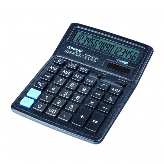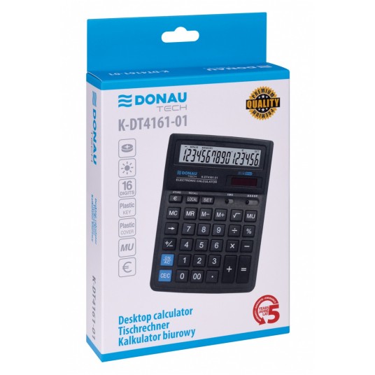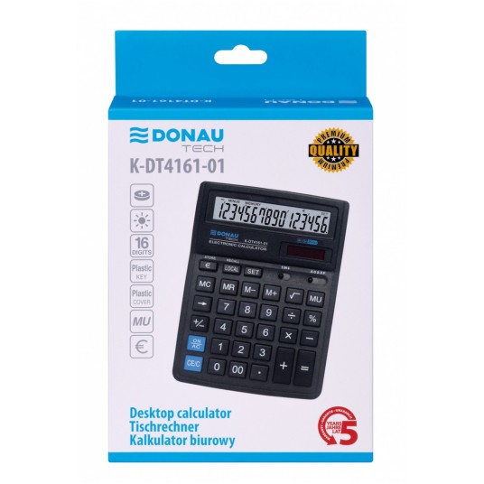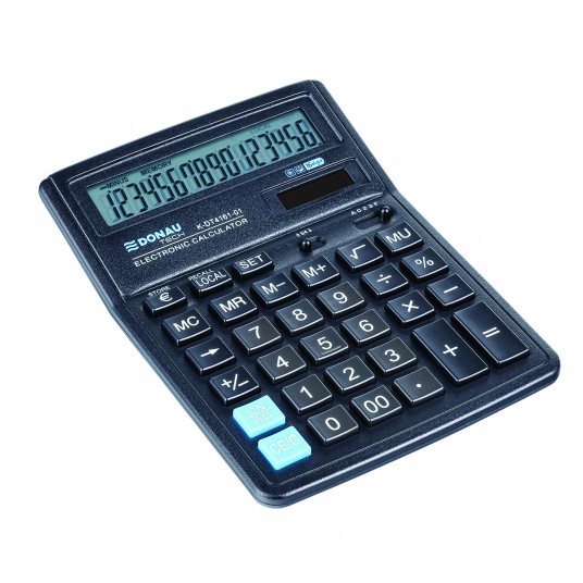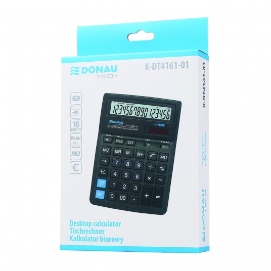 - Kalkulator biurowy z 16-cyfrowym wyświetlaczem z zasilaniem bateryjno-solarnym - Wymiary: 199 x 153 x 31 mm - Funkcja pierwiastka kwadratowego oraz obliczania procentów, obliczanie marży MU podwójne zero, kasowanie ostatniej pozycji, pamięć, ustawienie dziesiętne, zaokrąglanie wyniku, konwersja walut - Wyłącza się automatycznie - 5 lat gwarancji - Kolor: czarny