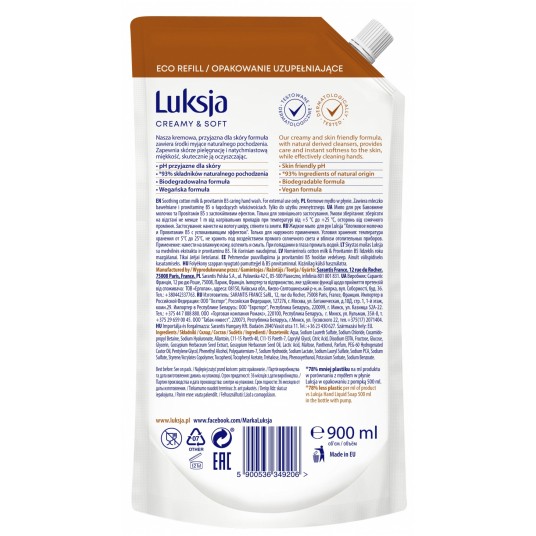 Mydło w płynie Luksja creamy&soft zapas 900ml mleczko bawełniane i prowitamina B5