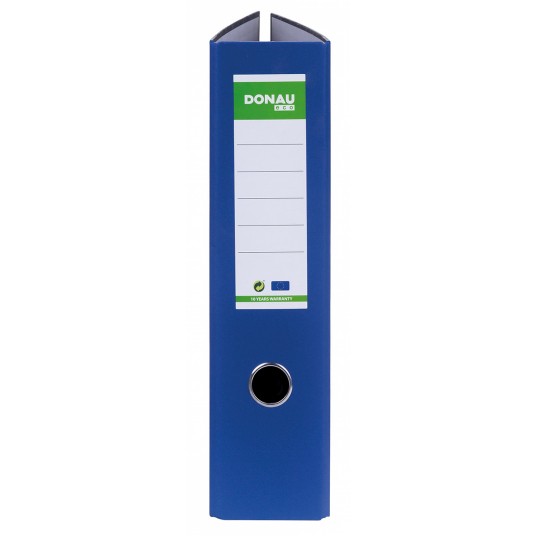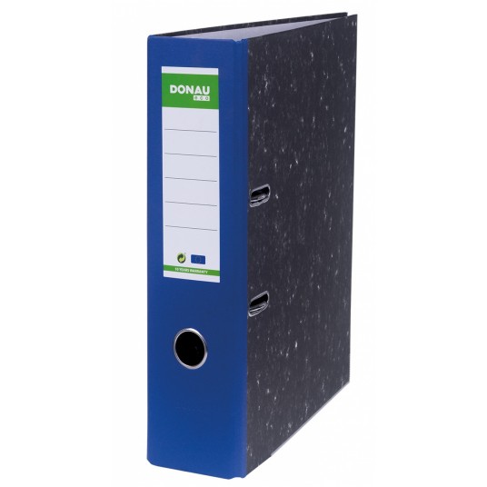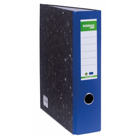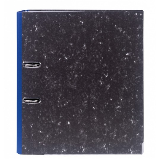 ekonomiczny segregator wykonany z tektury o grubości 2,2mm i gramaturze 1400gsm, wyposażony w dolną listwę wzmacniającą wewnątrz wyklejka papierowa o szarym zabarwieniu metalowy mechanizm i metalowa dźwignia wysokiej jakości z dociskaczem wzmocniony otwór na palec szerokość grzbietu: 80mm wymiary: 80x320x300 mm 5 lat gwarancji na mechanizm dźwigniowy opakowanie 10 szt. kolor: granatowy