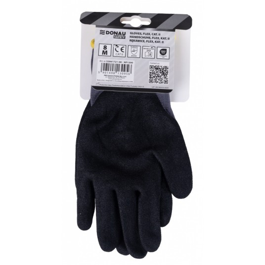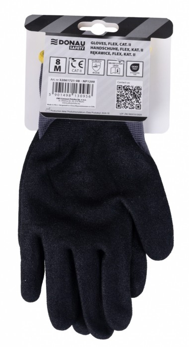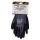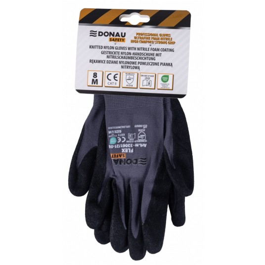 - Rękawice wykonane z dobrej jakości dzianiny nylonowej z elastanem w kolorze szarym, powleczone w części chwytnej ultradrobną pianką nitrylową w kolorze czarnym
