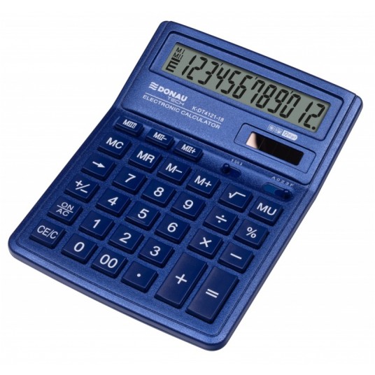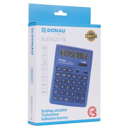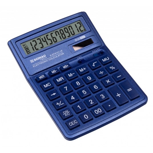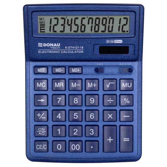 kalkulator biurowy z 12-cyfrowym wyświetlaczem z zasilaniem bateryjno-solarnym wymiary: 190 x 143 x 40 mm funkcja pierwiastka kwadratowego oraz obliczania procentów, obliczanie marży MU, podwójne zero, kasowanie ostatniej pozycji, podwójna pamięć, ustawienie dziesiętne, zaokrąglanie wyniku wyłącza się automatycznie instrukcja obsługi w języku polskim 5 lat gwarancji kolor: granatowy