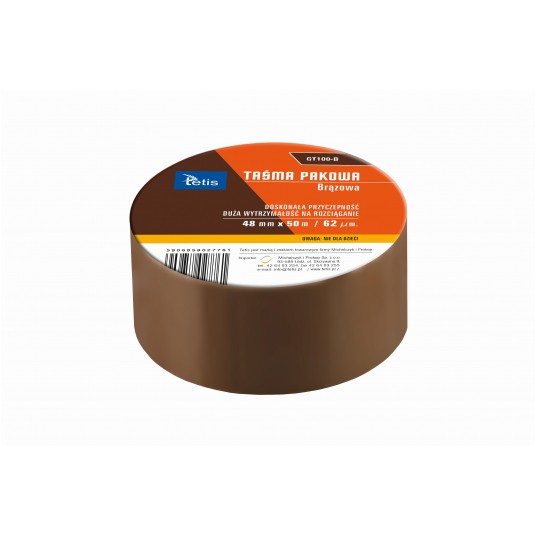 - Taśma pakowa o doskonałej przyczepności - Duża wytrzymałość na rozciąganie - Szerokość 48 mm - Długość 50 m - Grubość 62 mic - Kolor: brązowa Kod OSAA FF017 GT100-B