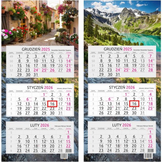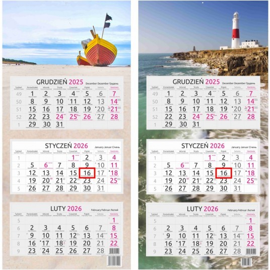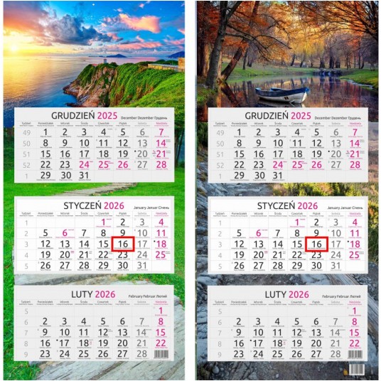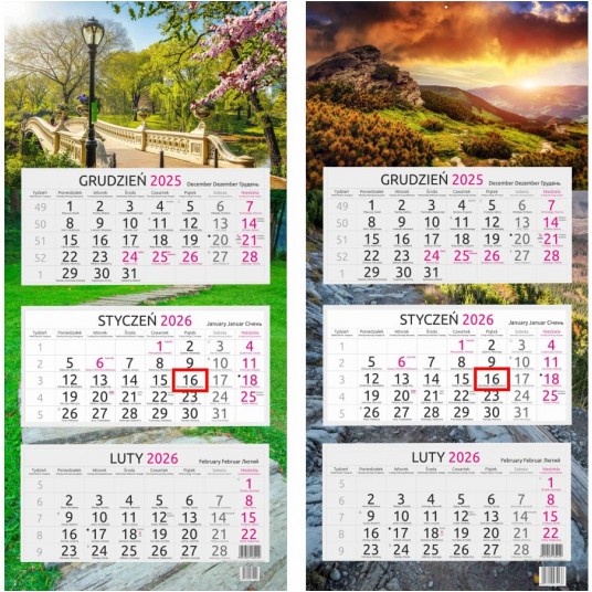 - Wymiary: 32 x 85 cm - Kalendarium: PL, GB, D, RUS z numeracją tygodni i z imieninami, trzy osobne kalendaria zawieszone na spirali, bieżący miesiąc wyróżniony kolorystycznie Wykończenie: pasek z czerwonym lub niebieskim okienkiem - Nadruk: 32 x 12 cm poniżej kalendarium lub pomiędzy kalendariami - Kolorystyka: druk czarno - czerwony lub niebiesko - czerwony - Ilość stron: 3 osobne kalendaria po 12 stron - Papier: 80g/m2 - Opcja: koperta kartonowa, nadruk na kopercie, pakowane w folie po 5 szt., - Główka: foliowana, wypukła, podklejona (kaszerowana) - Plecki: karton 350g