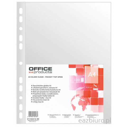 - Wykonane z miękkiej folii polipropylenowej o grubości 45µm - Krystaliczne, transparentne - Otwarte na górze - Antyelektrostatyczne - Odpowiednie do dokumentów w formacie A4 - Ilość dziurek do wpięcia: 11 - Rozmiar: 230x300mm - 100 sztuk w j.s. - Kolor transparentny