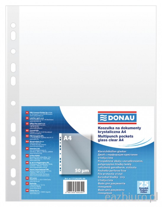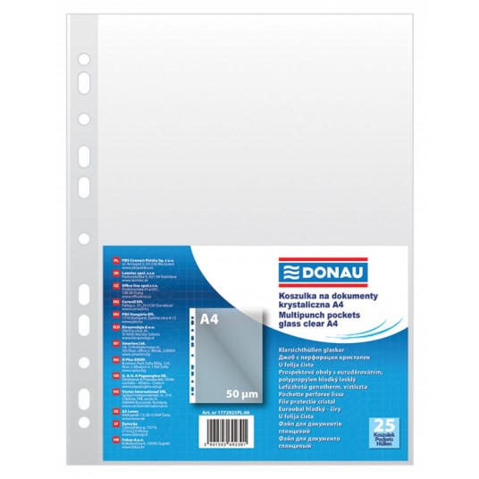 - Wykonane z miękkiej, gładkiej folii polipropylenowej o grubości 50µm - Krystaliczne, transparentne - Otwarte na górze - Antyelektrostatyczne - Odpowiednie do dokumentów w formacie A4 - Ilość dziurek do wpięcia: 11 - 10 sztuk w j.s. - Kolor transparentny