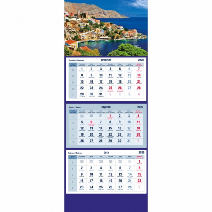 - Format: 315x855 mm - Rodzaj papieru: offset 80g/m2 biały - Układ kalendarium: 1 miesiąc - 1 kartka - Ilość stron: 12 - Druk: pełnokolorowy - Główka pełnokolorowa, okienko przesuwane, nazwy miesięcy i tygodni w wersjach językowych, miejsce na nadruk reklamowy