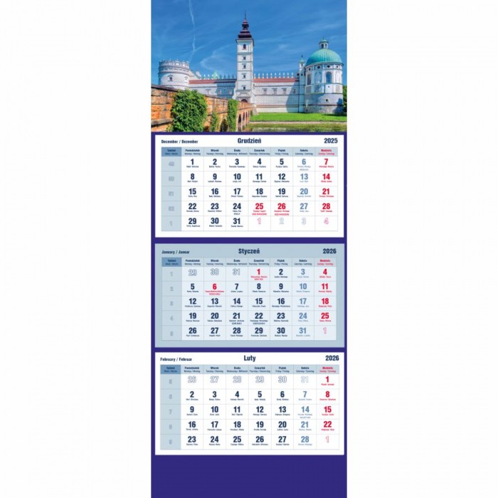 - Układ kalendarium: 1 miesiąc - 1 kartka